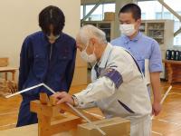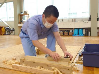 ものづくりマイスターの大工さんに教えに来ていただき、まずは、基本的な大工道具の扱い方を学びました。