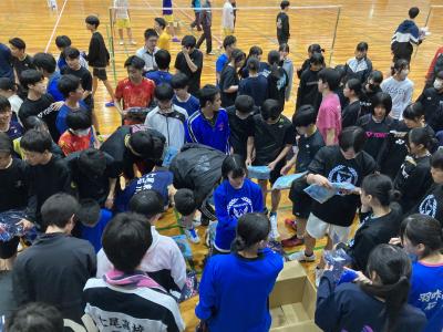 久しぶりの更新となりましたが、バドミントン部は今年度も明るく、元気に活動しています!新入生7名(男子4名・女子3名)を迎え、現在は5月22日(水)から開催される県総体に向けて、日々練習に励んでいます。写真は、4月27日(土)~29日(月)に行われた能登地区大会の様子です。一人一人が自分の課題を確認することができました。また、大会後には被災地への支援として届いたTシャツ等が配布され、生徒はありがたく受け取りました。当たり前のようにバドミントンができることに感謝して、日々活動していきます!