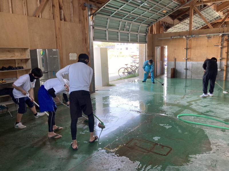 写真③掃き掃除後、水を入れ床をデッキブラシでゴシゴシ。