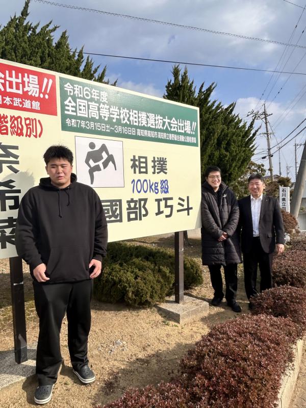 國部君が浅野先生、湊口先生、本校OBで羽咋相撲教室の北山さんと一緒に15・16日に高知県で行われる選抜大会に向けて出発しました。