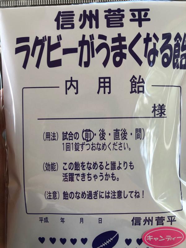 試合前には下記の写真にある菅平名物ラグビーがうまくなる飴を服用してから試合を行ったため、本当にラグビーがうまくなりました。おすすめです。