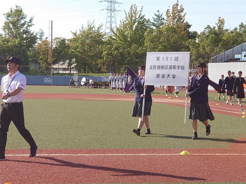 5県16代表が集った開会式が金沢市民野球場で行われ、本校マネージャー2名が大会名プラカードを持って参加しました。