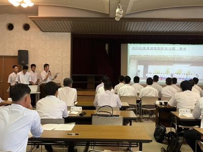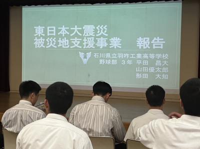 夏休み中に参加した、岩手県陸前高田市での東日本大震災被災地支援事業の高野連報告を、金沢市の石川県青少年総合研修センターで行いました。