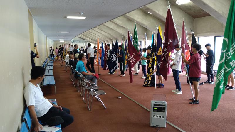 【開会式風景】参加校が部旗をもって整列し、選手宣誓がおこなわれます。