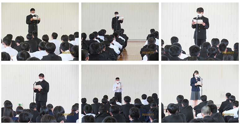 3年生の各クラスの代表者2名が全校生徒の前で自分の意見を発表しました。「トラブルに巻き込まれないようにインターネットの正しい使い方をする」、「ネットいじめは絶対にしてはいけない」など、規範意識をもって行動する大切さを一人一人の生徒が真剣に発表してくれました。