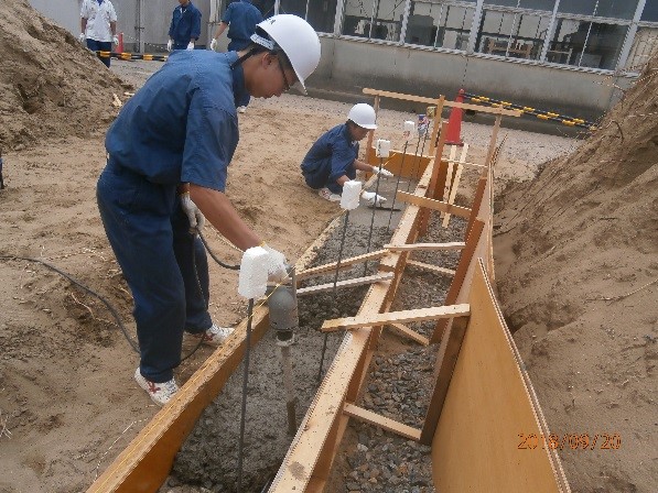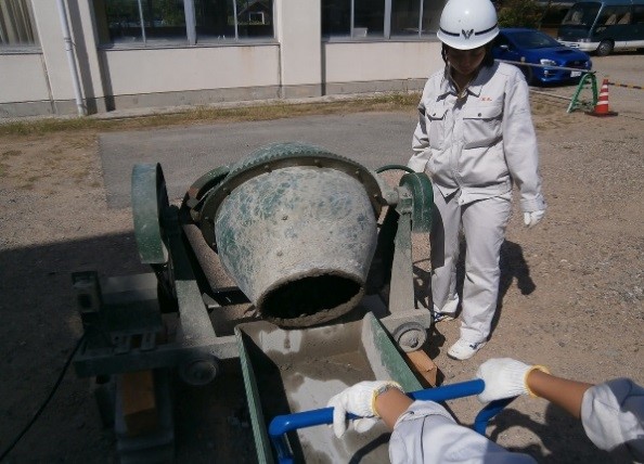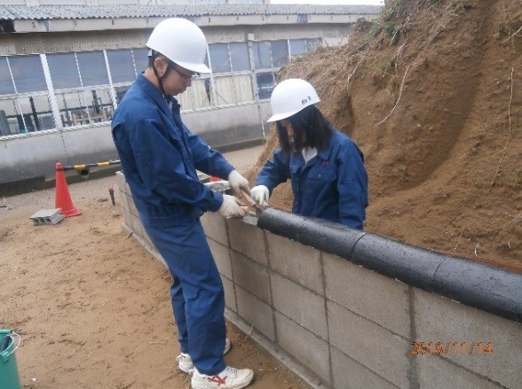 3年生土木コースの課題研究ではカラーコンクリートの製作と性能確認に取り組んでいます。着色による見た目だけの変化だけではなく、構造材料として十分な強度が確保できているかを確認する段階です。また、カラーコンクリートを使い花壇を作成しています。