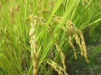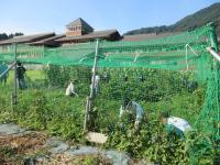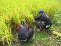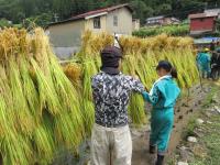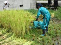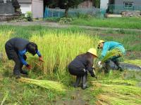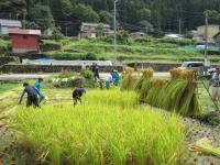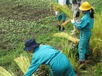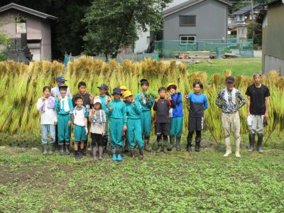 5・6年生 「稲刈り体験」 5月に苗植えをおこなった田んぼの稲が実りました。5・6年生みんなで稲刈りをしました。刈り取った稲をわらで束ねて稲架がけをします。