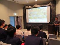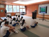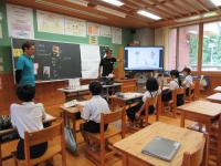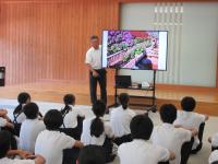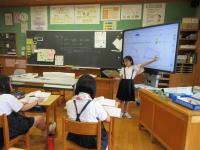5・6年生 写真を提示しながら夏休みの思い出を紹介しています。友達からの質問にも答えています。