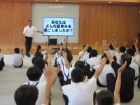 「2学期始業式」 校長先生から「どんな夏休みを過ごしたか」と問いかけがありました。楽しく過ごすことができた児童生徒がたくさん挙手しています。また、花壇の花の様子をたとえにして、友達に対する思いやりについてのお話がありました。