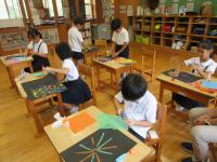 2年 図工「はくれい花火」 お花紙を手でちぎって思い思いに表現しています。