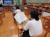 3年生 音楽 合唱曲の自分のパートを端末で聞いて確認したり、ピアノ伴奏で歌ったりしています。