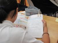 <中学校> 朝の時間に「かんガエル作文」(新聞のコラムを読んで要約文や意見文を書く取組)を行っています。