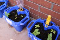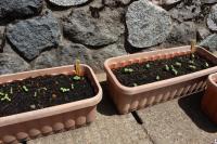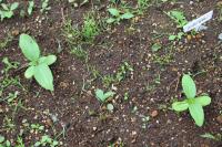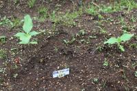 1年生のアサガオがふたば(子葉)になりました。ヒャクニチソウとヒマワリも芽を出しました。