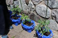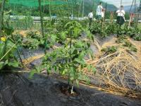 中2 技術 トマト、きゅうり、芋を栽培しています。芋は藁をしくことで葉がいたまないよう工夫しています。