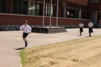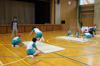 5・6年 体育 「体力テスト」 立ち幅跳びの記録を測定しています。