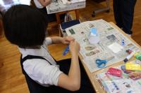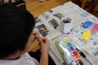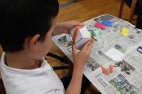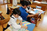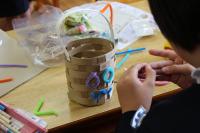 3・4年生 図工 3年生は「カラフルねんどでマイグッズ」 色つきの紙粘土で鉛筆立てや写真立てを作っています。4年生は「つないで組んですてきな形」 紙を編んだり結んだりしながら小物入れなどを作ります。