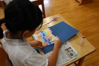 2年 図工「にじのカーテン」 画用紙に色鉛筆やクレパスで色を塗り、細長く切ったものを貼り付けました。きれいな模様になりました。