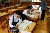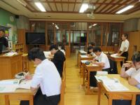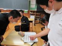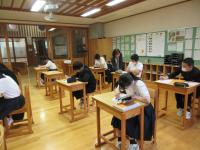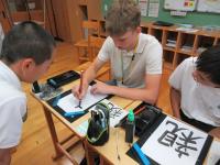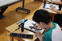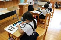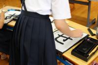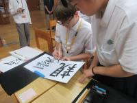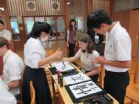 3限 中2国語(書道) コロンビアの生徒が選んだ漢字の熟語を白嶺生徒と協力して書いています。できた作品はお土産としてプレゼントしました。