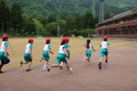 長休みはマラソン練習です。グラウンドには大きなトノサマガエルがいました。