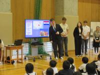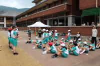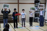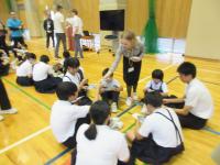 4限 小中全校児童生徒との交流 コロンビアの高校生によるコロンビアに関するクイズに、縦割り班のチーム対抗戦で盛り上がりました。