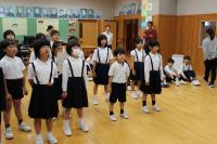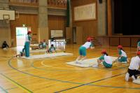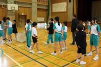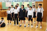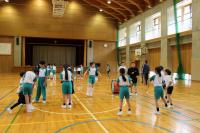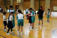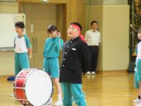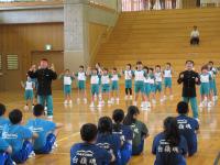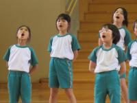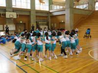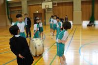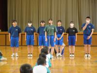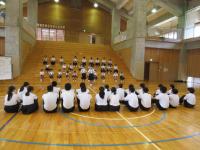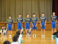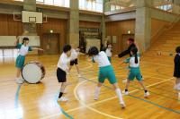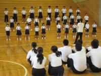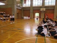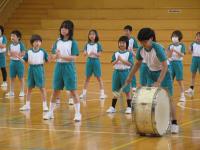 中学生の激励会に向けて、小学生が全校で応援団をつくりかけ声や手拍子などの練習をしています。