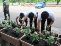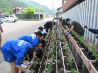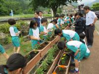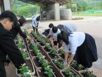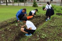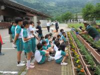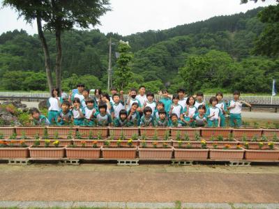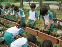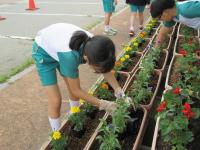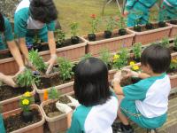 <小学校> 花の苗植え 5限目に校長先生にこつを教えてもらいながら、みんなで苗に「がんばろう!」と声をかけながら丁寧に植えました。