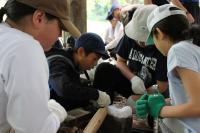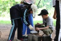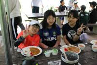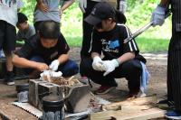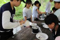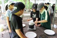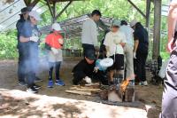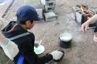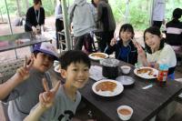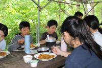 5年生 「山ろく4小学校 集合学習」合宿2日目、今日は野外炊飯を行いました。飯ごうでご飯を炊くために、かまどの準備からします。火を起こし薪で火力を調整します。どのグループもおいしいご飯が出来上がりました。カレーライスにして味わいました。2日間の活動を通して新しい友達ともすっかり打ち解けた様子です。いい思い出がたくさんできました。