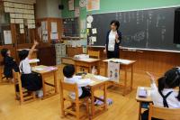 3年生 外国語活動 漢字の画数クイズをおこなっています。英語で画数を答えます。