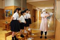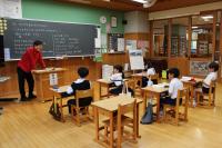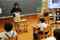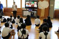 1年 生活科 「給食のひみつ」 給食室の仕事や調理の工夫について栄養教諭が説明しています。