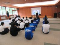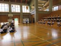 <小中学校> 激励会 本日昼休みに中学生部活動の大会勝利に向け、体育館で激励会が行われました。選手は力強く決意を述べ、小学生が熱いエールを送りました。