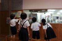 1年 生活科 給食室の見学です。外から調理場を見ています。大きな鍋など家の調理器具との違いにみんな興味津々。