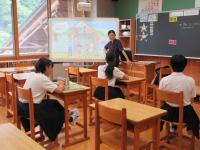 2限 中1・2・3英語 1年生は自己紹介、2年生は地域紹介、3年生は日本文化紹介をテーマに積極的に英語でやりとりをしています。
