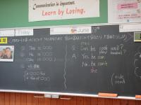 中1 国語では「しかし」や「だから」などの接続詞について、英語ではcanを使ったやりとりの練習をしています。