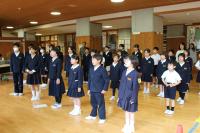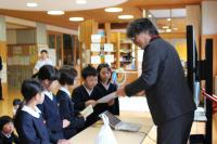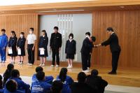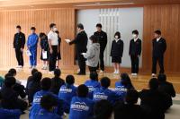 「白嶺交流集会」 小中学校 各委員会の委員長の認証式がありました。校長先生から認証状が手渡されます。新しい生徒会役員からは、前期生徒会目標の発表やあいさつ運動・緑の募金活動などのお願いがありました。