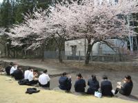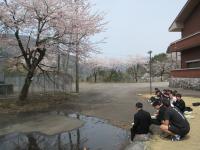 今日は2年生が桜の下で給食を食べました。外は大変暖かく、桜も満開です。