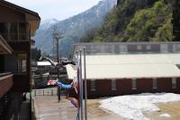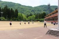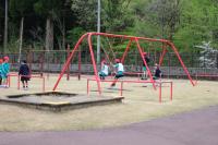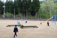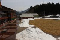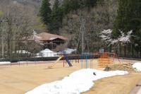 〈小中学校〉グラウンドの雪がまだ残っています。気温が上がりずいぶん減りましたが、今年は積雪が多かったためこの時期でも溶けていません。積雪から遊具を守る支柱なども外し、ようやくブランコや鉄棒、ジャングルジム、滑り台で遊べるようになりました。