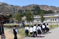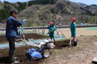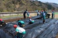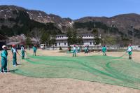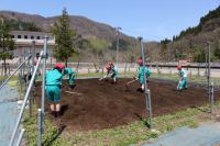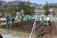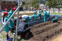 〈小学校〉 5・6年生が学校農園で畝作りやマルチかけをしました。防獣ネットを設置する準備も行いました。ちょうど1・2年が生活科の校外学習で通りがかり、「ありがとう!」「がんばってね」と応援してくれました。5・6年生は桜の花びらが舞う中、全校のみんなのために一生懸命作業をしてくれました。