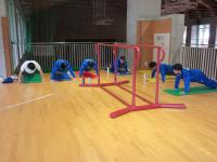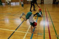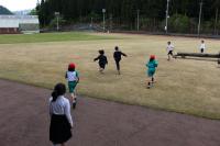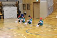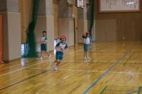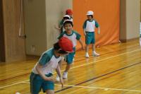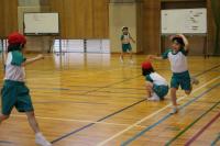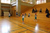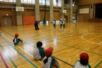 1・2年 体育 準備運動の後「こおりおに」を始める前に、先生のお話を聞いています。鬼になる子が3名選ばれました。作戦タイムの後、鬼ごっこスタートです。