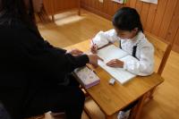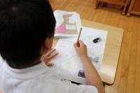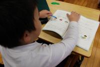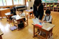 1年 国語 ひらがなの学習です。「ん」を使ったことばを考えています。名前を上手に書きました。