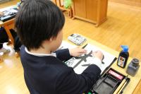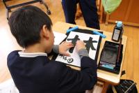 4年 書写「部分の組み立て方」 左右の部分の組み立て方を考えて書いています。「林」という文字は「木」がへんとつくりでどのように変化しているかな。