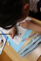 5年 理科「花のつくり」 ヘチマの種の観察をしています。インゲンマメと比べて色や形をよく見ています。