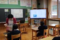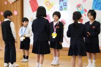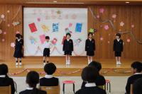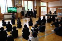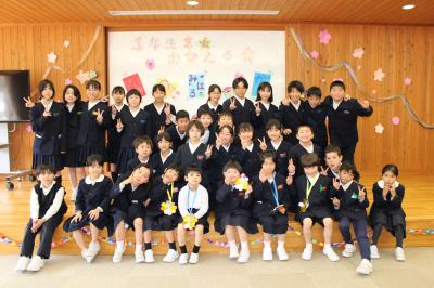 「1年生をむかえる会」 1年生へのインタビューやプレゼント渡しの他、たてわりグループでゲームをしたり全校で歌を歌ったりしました。1年生はみんな笑顔で過ごすことができ、5・6年生が企画・運営をしたこの会は大成功でした。