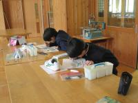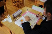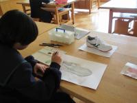 (1年生)美術の授業です。自然光のみの教室で、シューズの模写をしています。