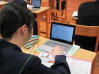(3年生)英語の授業です。学習者用デジタル教科書を使いながら、音読の練習をしています。