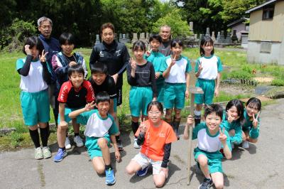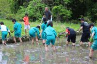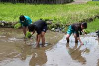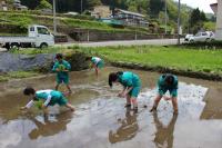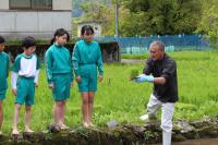 5・6年生は田植えを体験をしました。6年生は昨年の経験を生かして手際よく植えていました。中には家の手伝いをしたことのある子がいて、とても上手でした。予想以上に作業が早く終わりJAの職員の方々も感心していました。今日植えた苗は「ひゃくまん穀」という品種です。みんな9月の稲刈りが待ち遠しいようでした。