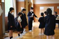 「あいさつ運動」 児童会の生活・放送委員会の取組です。登校してきた児童に、明るく元気なあいさつができるように呼びかけています。