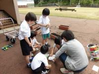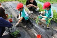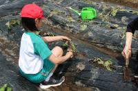 1・2年生 野菜の苗を畑とプランターに植えました。
