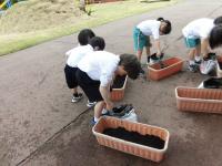 1年生は、プランターにコスモスの種をまきました。