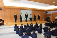 「新任式・始業式」 新しい先生方をお迎えし、令和7年度の白嶺小学校・白嶺中学校がスタートしました。始業式では校長先生から、校章に込められた意味の説明がありました。