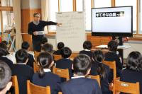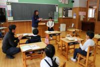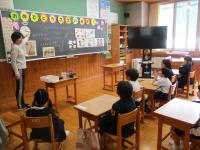 6年 社会「オリエンテーション」 6年生の社会科は中学校の先生が担当します。先生の自己紹介の後、6年生が先生の好きなものについていろいろ質問しています。